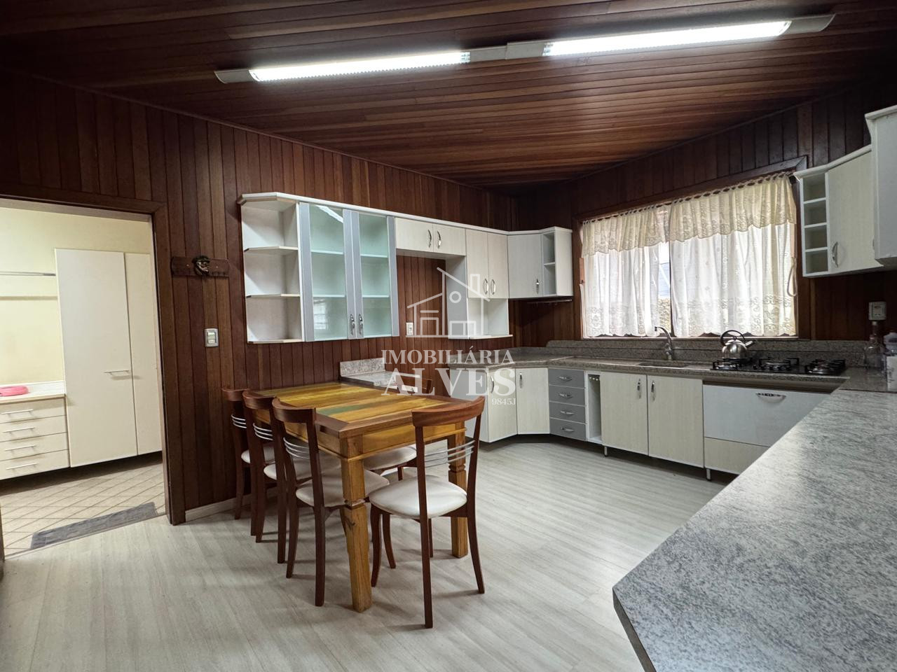 – Cozinha com armários, mesa com cadeiras fogão e cooktop
